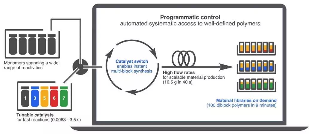 通過程序精準調控單體的加料順序,以及觸發(fā)反應的時間,該平臺還擁有合成復雜的嵌段共聚物或多嵌段共聚物的能力。