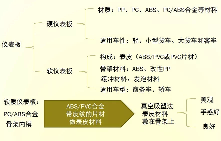 汽車儀表板是汽車上的重要功能件與裝飾件,是一種薄壁、大體積、上面開有許多安裝儀表用孔和洞的形狀復(fù)雜的零部件,是安裝汽車各類儀表的支架,在駕駛室的前部。根據(jù)車的種類不同,可分為主儀表板和副儀表板。目前,汽車儀表板主要采用的改性塑料有:ABS塑料、PC/ABS合金材料和改性PP-聚丙烯。